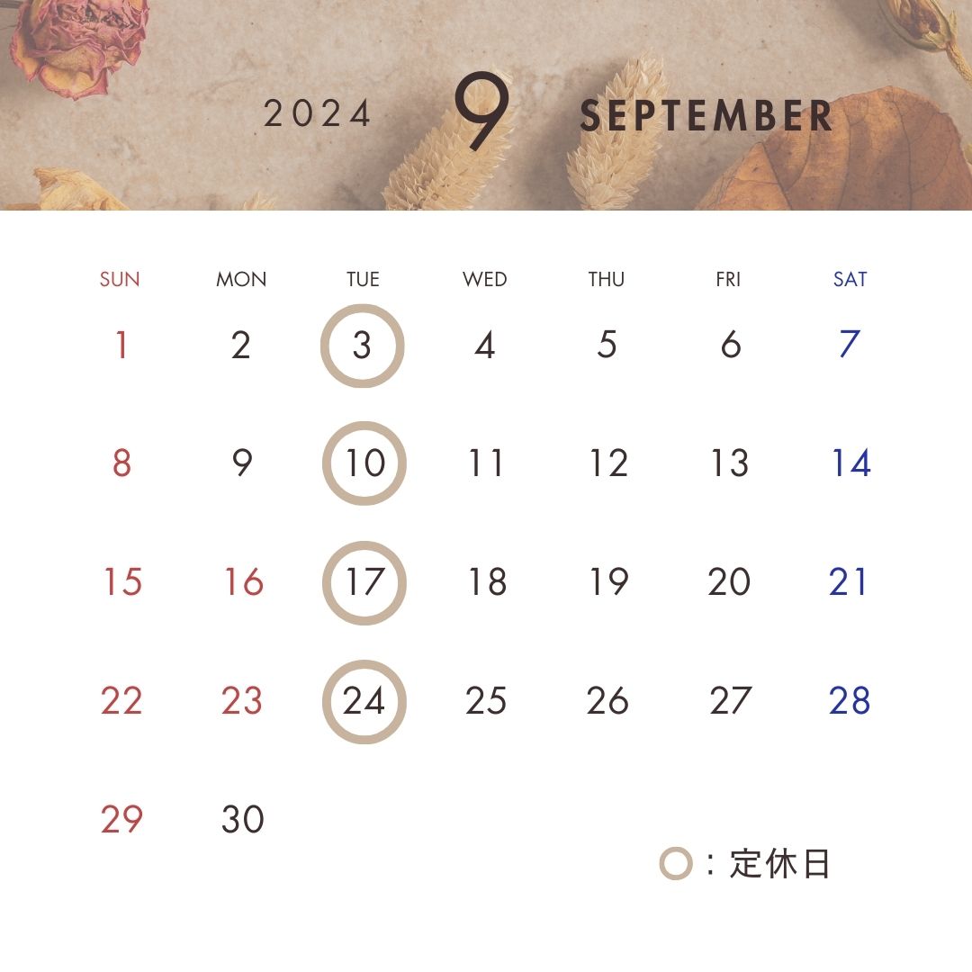 9月は、3連休が続きますが当店は、通常通り火曜日が定休です。